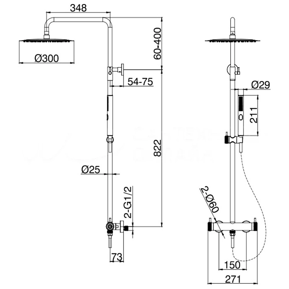 - Комплектация - душевая стойка, смеситель, шланг, лейки, крепления